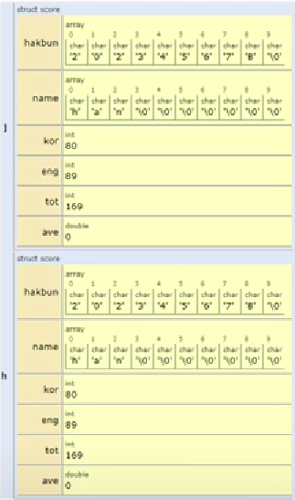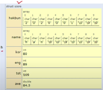 struct score h = {"2020001", "han", 80, 90}; // 초기화