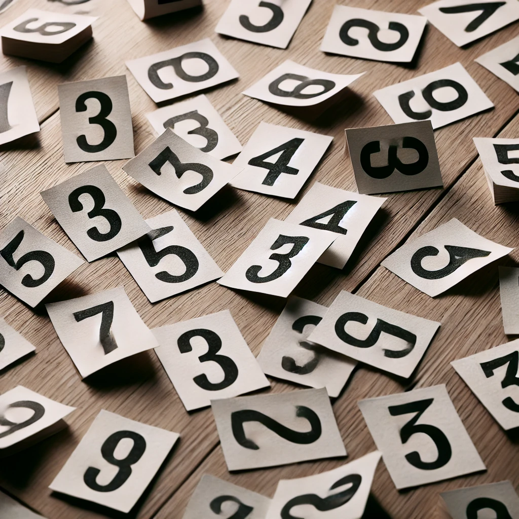 한 자리 숫자가 적힌 종이 조각이 흩어져 있습니다.