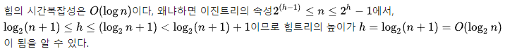 힙(heap)은 최댓값 및 최솟값을 찾아내는 연산을 빠르게 하기 위해 고안된 완전이진트리(complete binary tree)를 기본으로 한 자료구조(tree-based structure)로서 다음과 같은 힙 속성(property)을 만족한다.