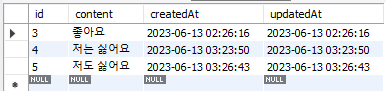 columns : id(int, PK, NN, UN, AI), content(varchar(200)), createdAt(timestamp)