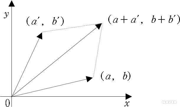 벡터의 합을 정의하는 데 위의 그림에서와 같은(그림 이상한데..) 평행사변형의 법칙을 일반화하여 사용한다. 즉,