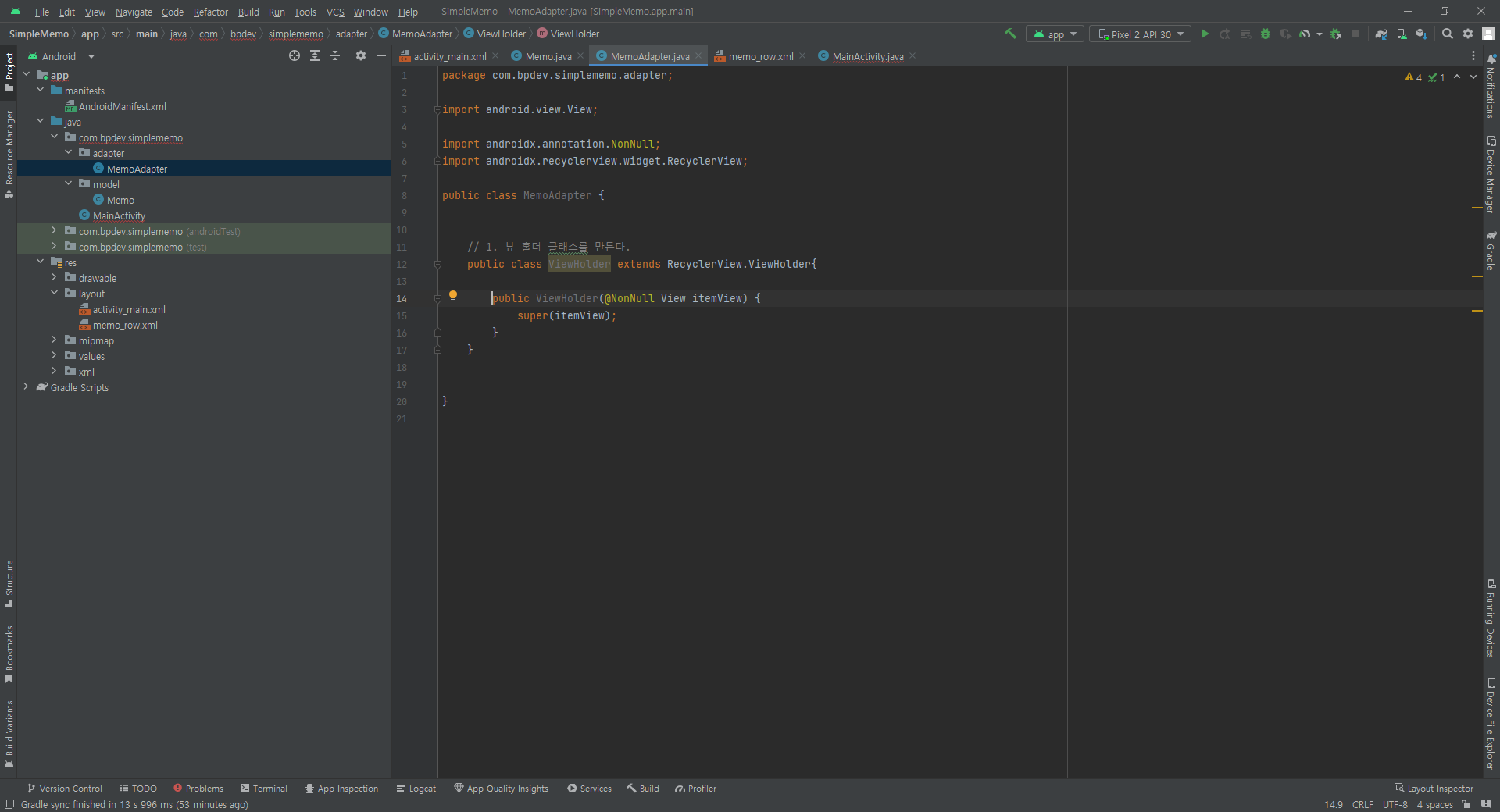 // ViewHolder 코드 완성한 후, 이름을 내가 만든 MemoAdapter.ViewHolder로 변경해 준다.