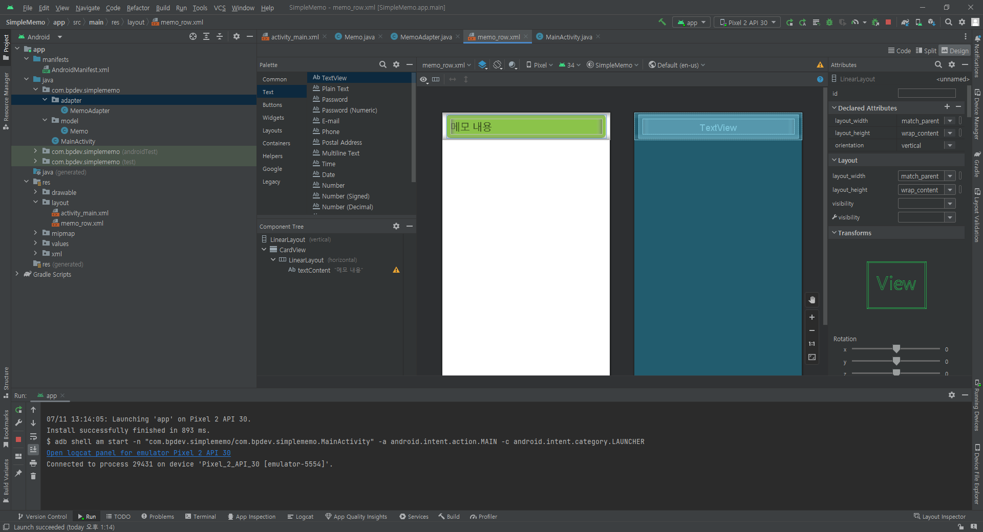 holder.txtContent.setText( memo.content ); // Memo.java에서 변수 public으로 변경해주었다.