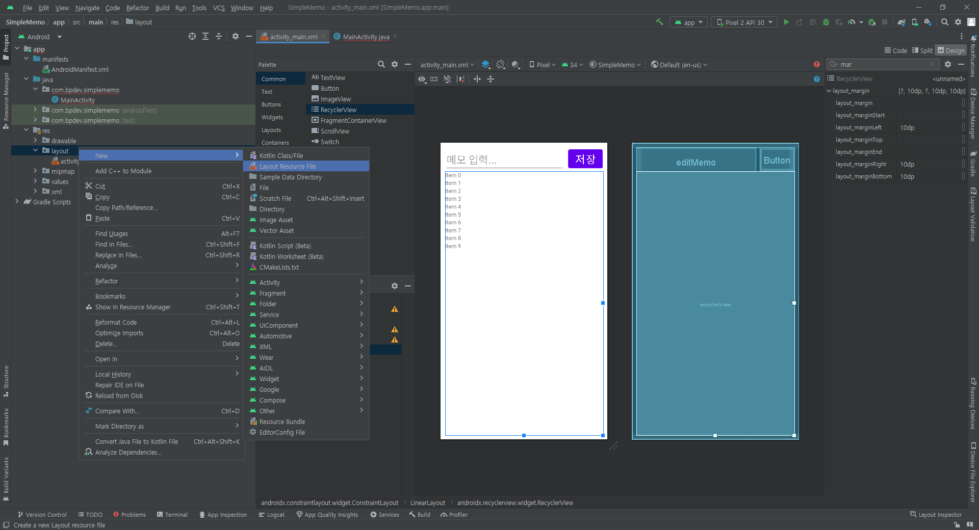 memoList.add(0, memo); // 메모리스트에 메모 추가 저장함 // index:0 설정을 해 주면 최근에 입력한 것이 위에 나온다.