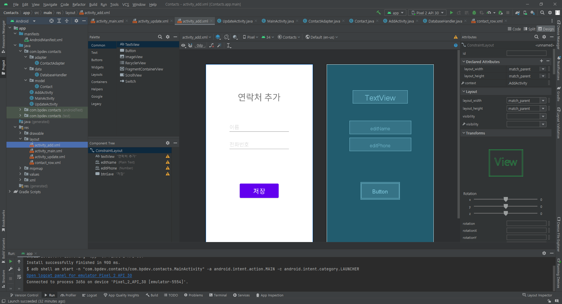 DatabaseHandler handler = new DatabaseHandler(AddActivity.this, "contact_db", null, 1); // 이름들을 정해준다.